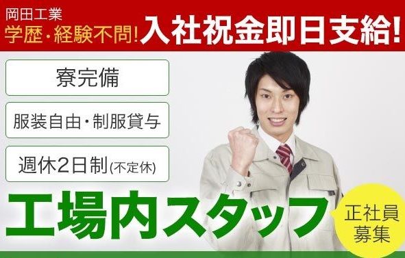 屋根・外壁・建築工事を支える軽作業を行っていただきます! 主に個人宅の塗装工事で使用する資材・建材の準備や加工をお任せします。 ✅入社祝金10万円! ✅即日採用! 即入寮可! ✅老若男女問わず輝ける!! ✅未経験からでもプロになれる! 経験は一切不問です! 業界未経験でも私達が親切丁寧に指導しますのでご安心ください♪ もちろん以前同じような業種の経験をお持ちの方も大歓迎! 即戦力として働けます!! 岡田工業は、地域密着型の塗装会社として、設立以来多くのお客様と出会い、 全ての建物に対し真剣に向き合ってまいりました。 お客様の大切な資産を、お守りするため、常にお客様の立場や気持ちとなり、 仕事をさせていただいていることに感謝し、真心込めながら施工を行なっています。 これからも末永いパートナーで在り続けるため、 私たちと共に歩んでくれる方を募集しています!!